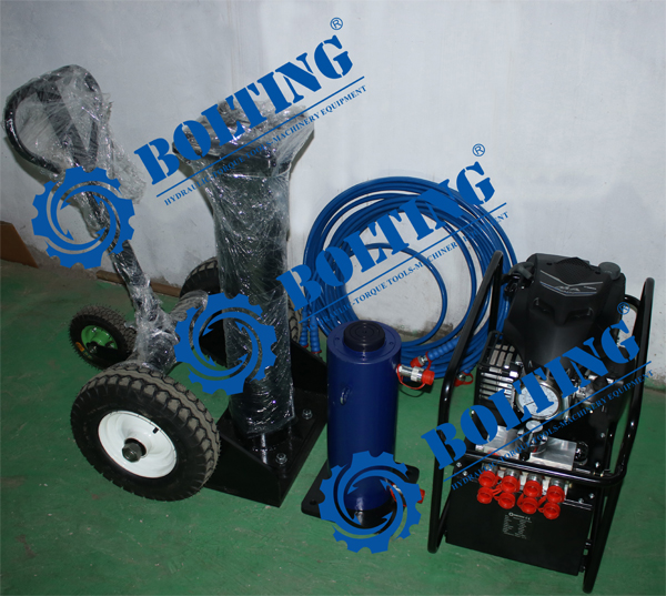 為河南某重工企業定制的移動式液壓駕車機、汽油發動機動力液壓泵、雙作用液壓千斤頂準備發貨