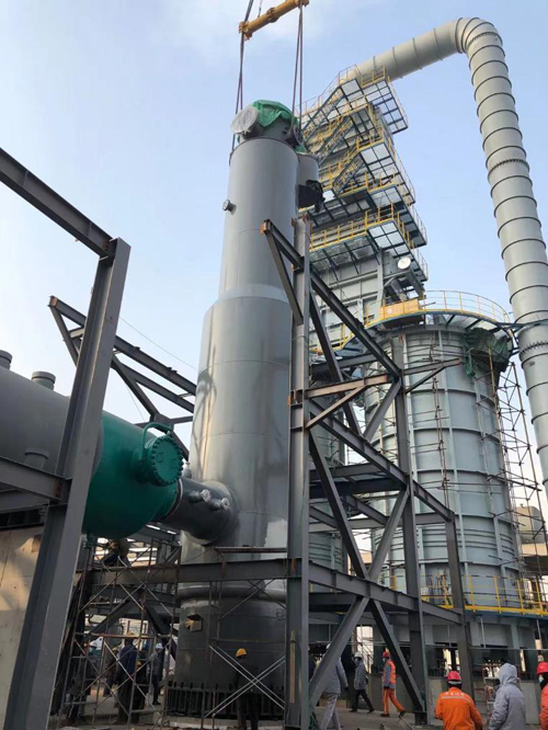 該轉化爐重達105噸,高達16.3米,分上下兩段,下段高約7.8米,直徑為3米,上段高約8.5米,直徑為2米,采用400噸履帶吊為主吊,180噸履帶吊為尾吊,在中化二建的全力配合下一次吊裝就位成功。其作用是將焦爐氣,根據純氧轉化進料氣(蒸汽/碳)的摩爾比,加入適量的中壓蒸汽后,送往焦爐氣加熱爐加熱到450℃,去自熱式純氧轉化爐(ATR)進料,最終生產出合格轉化氣。