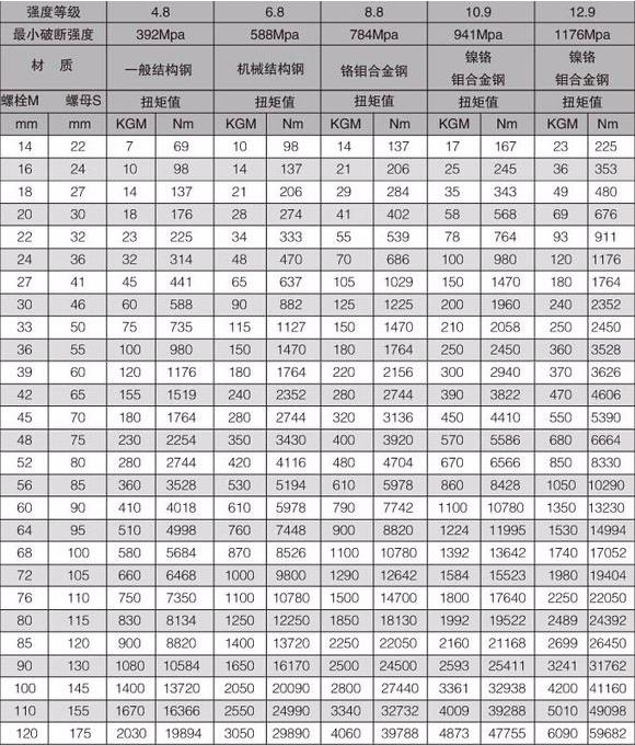 相信許多用戶在選購液壓扭矩扳手之前都看過液壓扳手扭矩對照表,液壓扳手扭矩對照表其實就是螺栓扭矩值推薦表,它主要被用來查詢螺栓螺母的強度等級、材質和螺栓大小扭矩值的一張表格,能夠更好的幫助用戶選擇合適的扳手型號,下圖就是液壓扳手扭矩對照表。