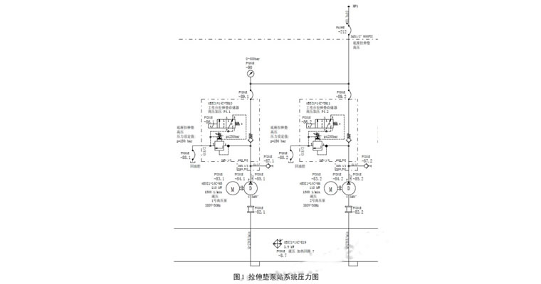 拉伸墊泵站由控制油泵、高壓油泵、低壓油泵、循環(huán)冷卻泵組成。實(shí)際工作中,除開其它原因?qū)е碌谋脝?dòng)條件不滿足的情況外,系統(tǒng)壓力故障主要有兩種情況,液壓泵損壞和泵出口控制閥損壞。液壓泵或電機(jī)損壞直接導(dǎo)致系統(tǒng)無壓力,這種故障查找也非常簡單:啟動(dòng)液壓泵檢查電機(jī)和泵的運(yùn)行狀態(tài),如果運(yùn)行正常,泵體和進(jìn)出油管溫度與油箱溫度接近,說明泵沒有問題;如泵不能啟動(dòng),即可排查電機(jī)控制電路的熔斷器,如熔斷器正常,即可檢查電機(jī)繞組;若出現(xiàn)液壓泵能夠啟動(dòng)但超負(fù)載的現(xiàn)象,需要拆分電機(jī)和泵的連接,分別盤車,排查故障是電機(jī)還是泵的原因造成。液壓拉伸墊泵站采用先導(dǎo)式溢流閥、換向閥和單向閥的組合,實(shí)現(xiàn)系統(tǒng)供油和泵無壓循環(huán)功能,如圖 1 所示:拉伸墊動(dòng)作時(shí)系統(tǒng)壓力開關(guān)監(jiān)控到壓力降低至最小工作壓力,就會(huì)給出指令到控制溢流閥的換向閥;換向閥得電斷開先導(dǎo)閥回油,溢流閥停止無壓循環(huán)開始往系統(tǒng)供油;當(dāng)系統(tǒng)壓力達(dá)到最大工作壓力后換向閥失電,系統(tǒng)開啟無壓循環(huán),單向閥阻止系統(tǒng)油液回流。由于從供油至無壓循環(huán)交替的過程中,單向閥也會(huì)隨開啟關(guān)閉動(dòng)作,插裝式單向閥關(guān)閉時(shí)如果進(jìn)出口壓差過大,閥芯關(guān)閉就會(huì)沖擊閥體,可能導(dǎo)致閥體碎裂,泵出口油路與回油管直通。若拉伸墊設(shè)備在投入使用初期,可能會(huì)多次出現(xiàn)單向閥損壞使得系統(tǒng)壓力不能建立故障,這就需要調(diào)低先導(dǎo)式溢流閥的開啟壓力即可解決這個(gè)問題。而溢流閥的壓力調(diào)整可以根據(jù)壓力切換時(shí)的狀態(tài)來調(diào)整,可先將壓力調(diào)高至單向閥關(guān)閉時(shí)到出現(xiàn)嚴(yán)重撞擊閥體上限,再略微調(diào)低壓力,直到單向閥柔和關(guān)閉為止。溢流閥壓力調(diào)整太低則會(huì)導(dǎo)致系統(tǒng)達(dá)不到最高壓力而一直供油,油液一直溢流回油箱的現(xiàn)象。