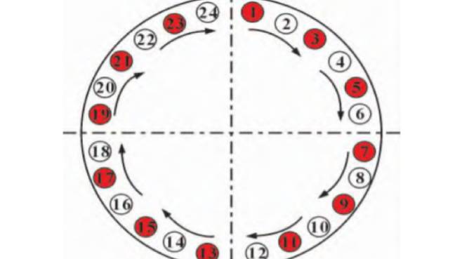 如上圖24路螺栓法蘭50%螺栓拉伸器覆蓋編號圖我們可以看出,螺栓依然是依次編號,只不過在安裝螺栓拉伸器時是總數(shù)分為兩組,隔一顆安裝,總體覆蓋便可以達(dá)到50%也就是12顆。安裝好之后按步驟拉伸即可。如此可知,24路螺栓法蘭25%的螺栓覆蓋需要做到6同步編號,也就是6組4個號,先均分為6個點(diǎn)標(biāo)“1”,再取間隔之中為“2”,依次取中編“3”,編“4”,編完即可。拉伸時按照編號分次拉伸。