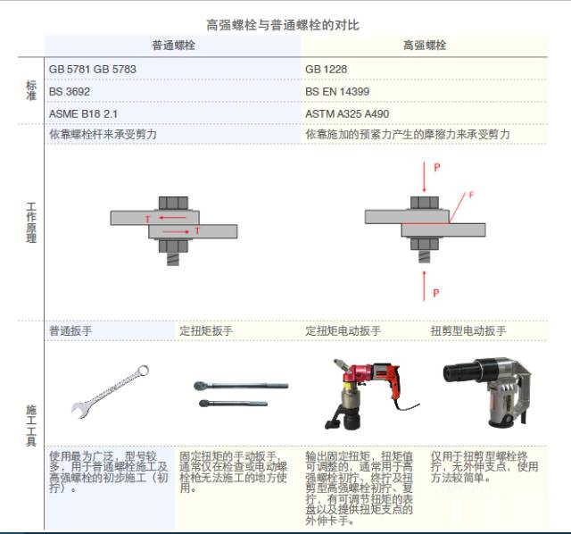 高強螺栓(High-Strength Friction Grip Bolt),英文直譯為:高強度摩擦預緊螺栓,英文簡稱:HSFG。可見,我們中文施工中所說的高強螺栓是高強度摩擦預緊螺栓的簡稱。在日常溝通中,僅僅是簡略了“摩擦(Friction)”“預緊(Grip)”兩個詞,卻造成了許多工程技術人員對高強螺栓基本定義的理解,產生了誤區。