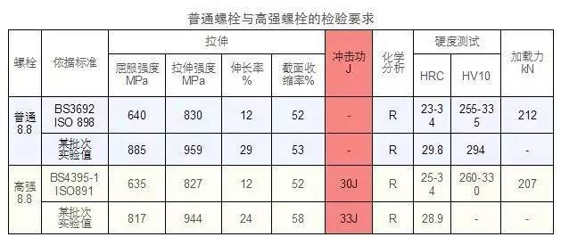 同等級普通螺栓各項機械性能要求均比高強螺栓略高,但高強螺栓較普通螺栓多一項沖擊功的驗收要求。