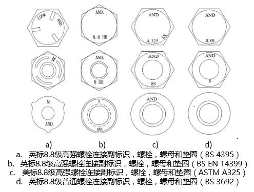 普通螺栓和高強螺栓的標示是對同等級螺栓現場識別的基本方法。由于英美標準中對于高強螺栓扭矩值計算的取值并不相同,所以識別兩種標準的螺栓也有必要。