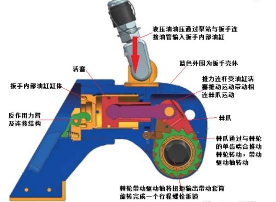 電動(dòng)液壓泵啟動(dòng)后在內(nèi)部通過(guò)電機(jī)馬達(dá)產(chǎn)生壓力,將內(nèi)部的液壓油通過(guò)油管介質(zhì)傳送到液壓扳手,然后推動(dòng)液壓扳手的活塞桿,由活塞桿帶動(dòng)扳手前部的棘輪,使棘輪能帶動(dòng)驅(qū)動(dòng)軸來(lái)完成螺栓的預(yù)緊工作。下面是液壓扳手內(nèi)部原理圖: